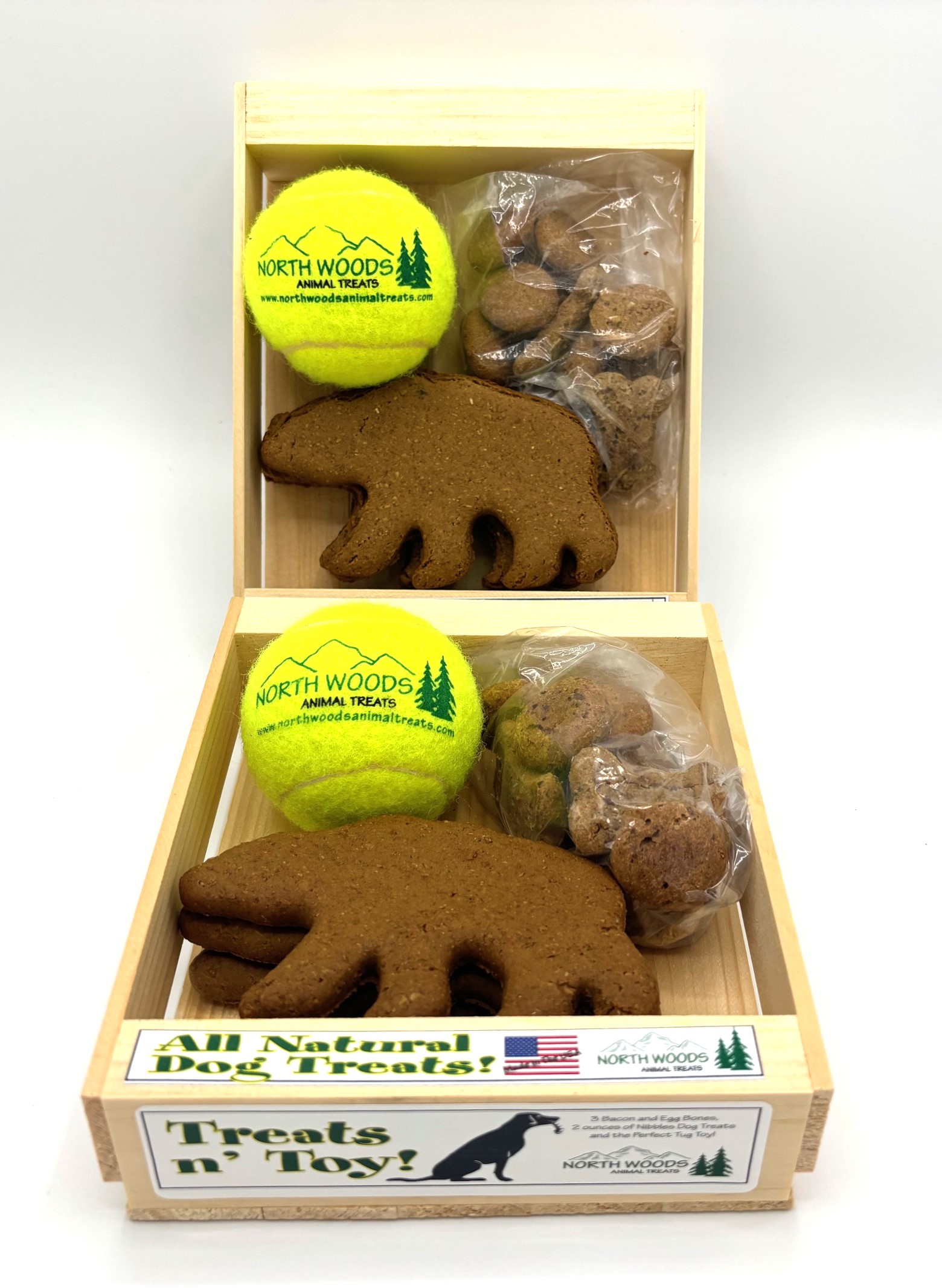 8 individual gift crates of Treats n' Toy - BALL come in a ship box. Each hand made, reusable pine crate comes with 3 large Peanut Butter Bears, 1.5 ounces of Nibbles (Peanut Butter Bones and Cheddar Rounds) and the perfect dog ball. The ball is non abrasive and uses dog safe soy ink.