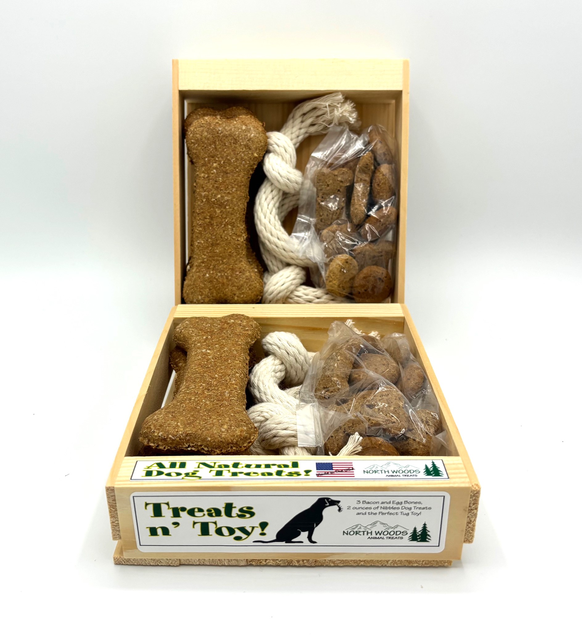 8 individual gift crates of Treats n' Toy - TUG come in a ship box. Each hand made, reusable pine crate comes with 3 large Bacon and Egg Bones, 1.5 ounces of Nibbles (Peanut Butter Bones and Cheddar Rounds) and the perfect tug toy. The tug is 100% cotton, hand made, and of course, the rope is made in the USA!