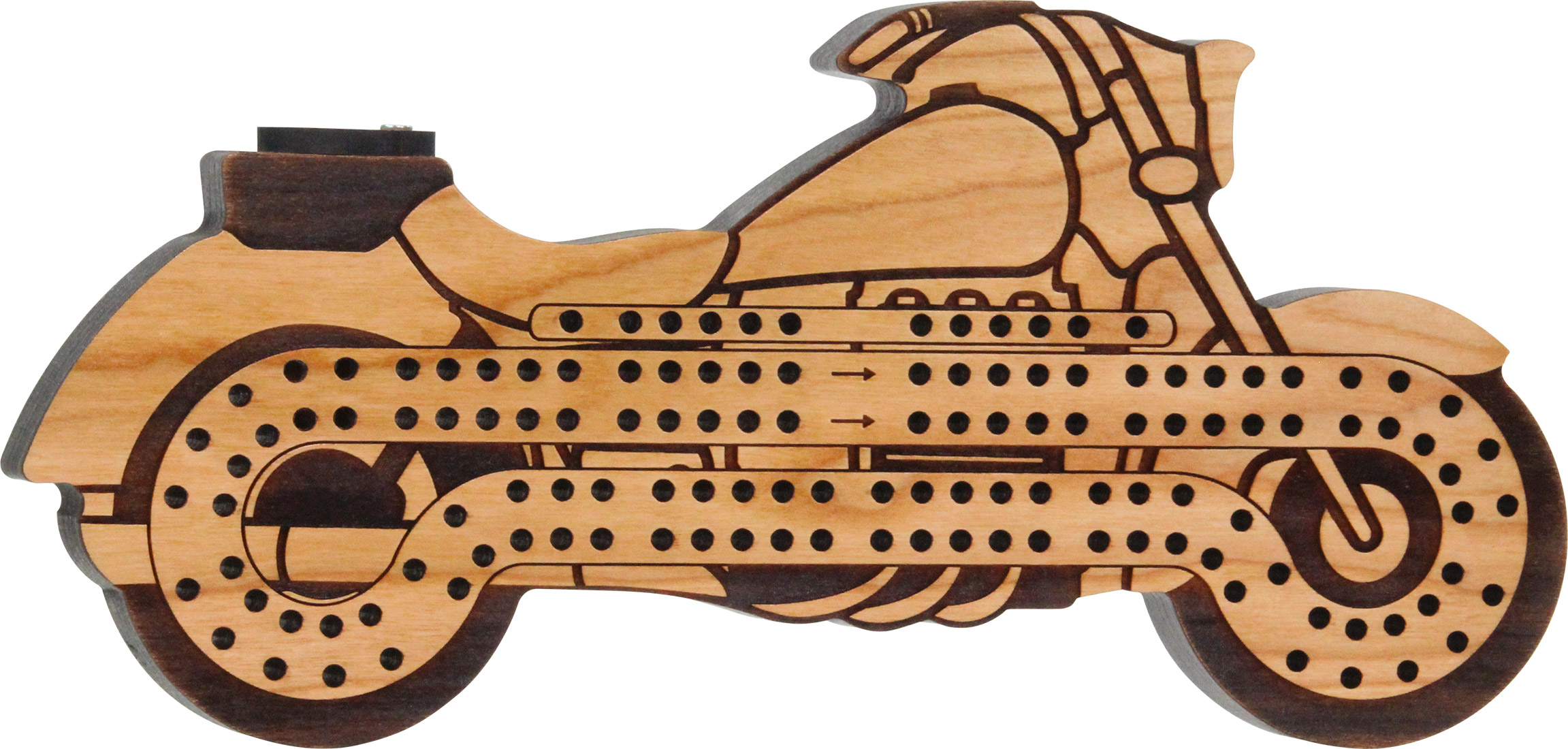 Born to be wild...or at least born to play cribbage! Our wooden Motorcycle Cribbage features laser engraved details, standard two street by 60 hole configuration, pegging out holes, game counter holes, and a closable peg storage compartment under the seat. Crafted from cherry, Motorcycle Cribbage board measures about 10.5" long by 5" high and 0.75" thick. Pegs and instructions are included.Pegs are colored using a dye stain and sealed with a teak oil.