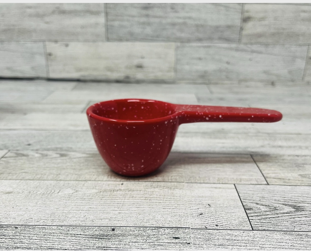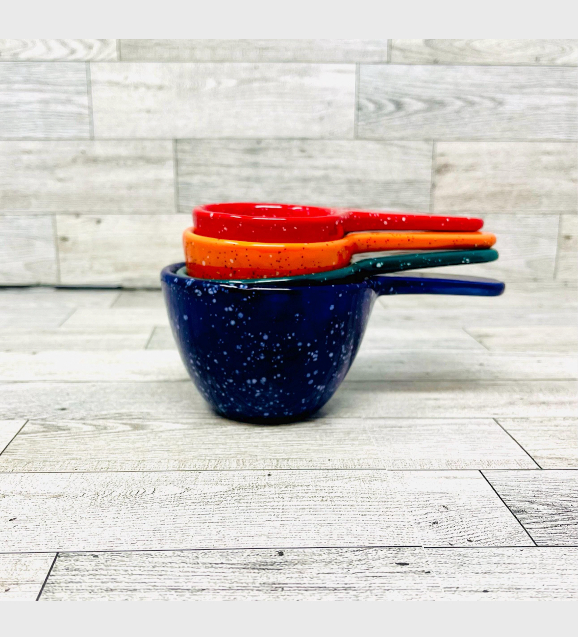 These colorful measuring cups are made out of clay and handpainted. These cups have a large measure written on the bottom of each,. Large handled for easy handling.